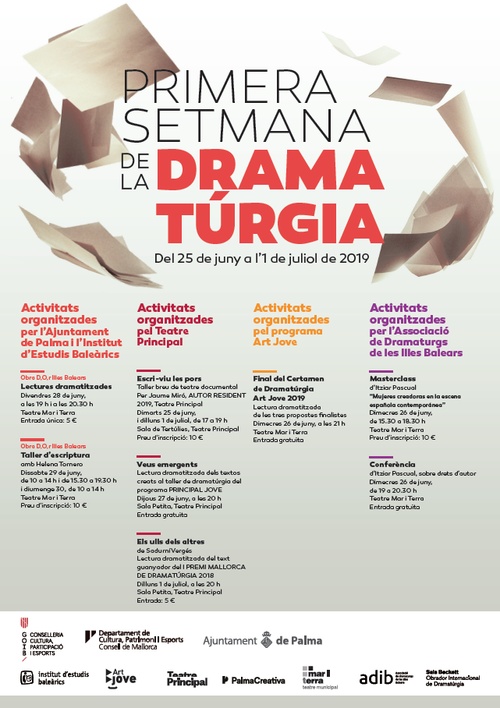 La Conselleria de Cultura Participació i Esports, a través de l’Institut d’Estudis Baleàrics (IEB), participa de la Primera Setmana de la Dramatúrgia, una iniciativa conjunta de l’IEB, la Regidoria de Cultura, Patrimoni, Memòria Històrica i Política Lingüística de Palma, el Teatre Principal de Palma, el programa cultural Art Jove i l’Associació de Dramaturgs de les Illes Balears (ADIB).
