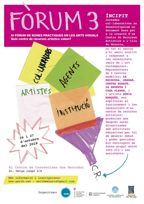 El III Fòrum de bones pràctiques en les arts visuals està organitzat per l'AAVIB (Associació d'Artistes Visuals de les Illes Balears), juntament amb l'Institut d'Estudis Baleàrics, el Consell de Menorca i l'Ajuntament del Mercadal. L'objectiu de la celebració d'aquest fòrum públic envers les bones pràctiques és generar pensament, formació teòrica i pràctica i dotar d'eines per a la millora de la gestió i creació estructural en l'àmbit de l'art contemporani.