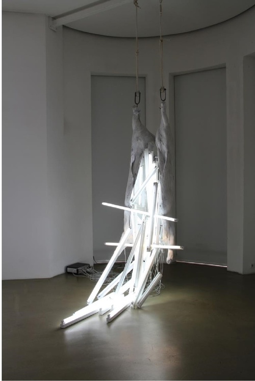 Les 6 figures masculines han estat esculpides en resina de polièster, combinades amb tubs florescents que caracteritzen l’obra de Roig i són el focus de l’exposició. Les escultures descansen sobre parets i portes i entren en conflicte amb la llum, una llum que enlluerna en lloc d’il·luminar i aïlla aquestes figures.