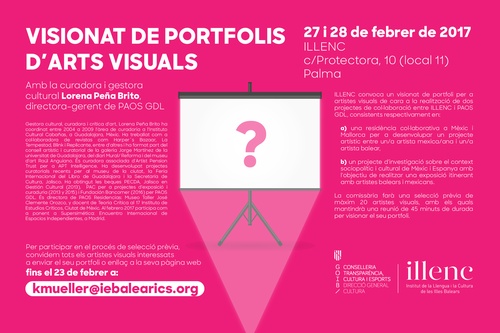 Per a participar en el procés de selecció prèvia, convidem tots els artistes visuals interessats a enviar el seu portfoli o enllaç a la seva pàgina web fins el 23 de febrer a: kmueller@iebalearics.org