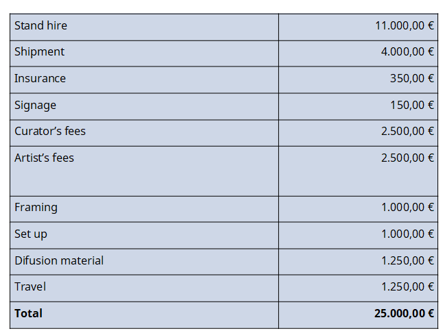 The estimate for the general budget of the exhibition project is €25,000.00 (see annex 1) and includes the concepts of renting the stand; concentration and dispersion transport; turnkey insurance; fees of suppliers, professionals and artist; dissemination material; framing, and displacements.