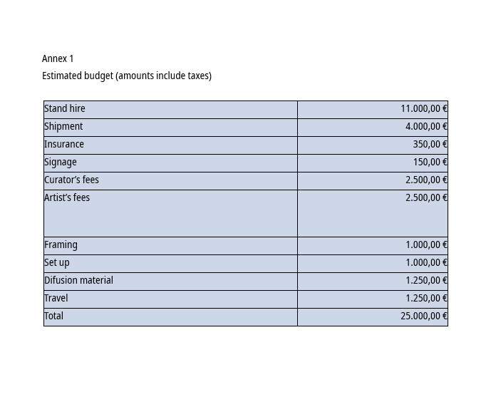 The forecast for the general budget of the exhibition project is €25,000.00 (see annex 1) and includes the concepts of renting the stand; concentration and dispersion transport; turnkey insurance; fees of suppliers, professionals and artists; dissemination material; framing, and displacements.