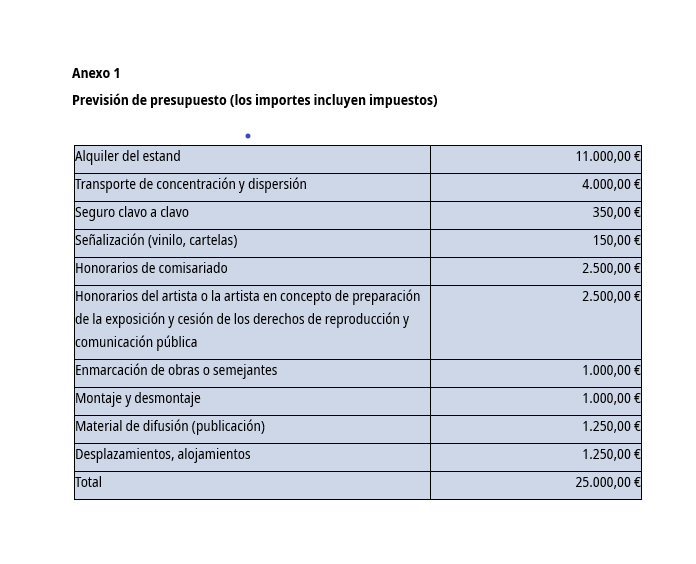 La previsión del presupuesto general del proyecto expositivo es de 25.000,00 € (véase el anexo 1) e incluye los conceptos de alquiler del estand; transporte de concentración y dispersión; seguro clavo a clavo; honorarios de proveedores, profesionales y artistas; material de difusión; enmarcación, y desplazamientos.